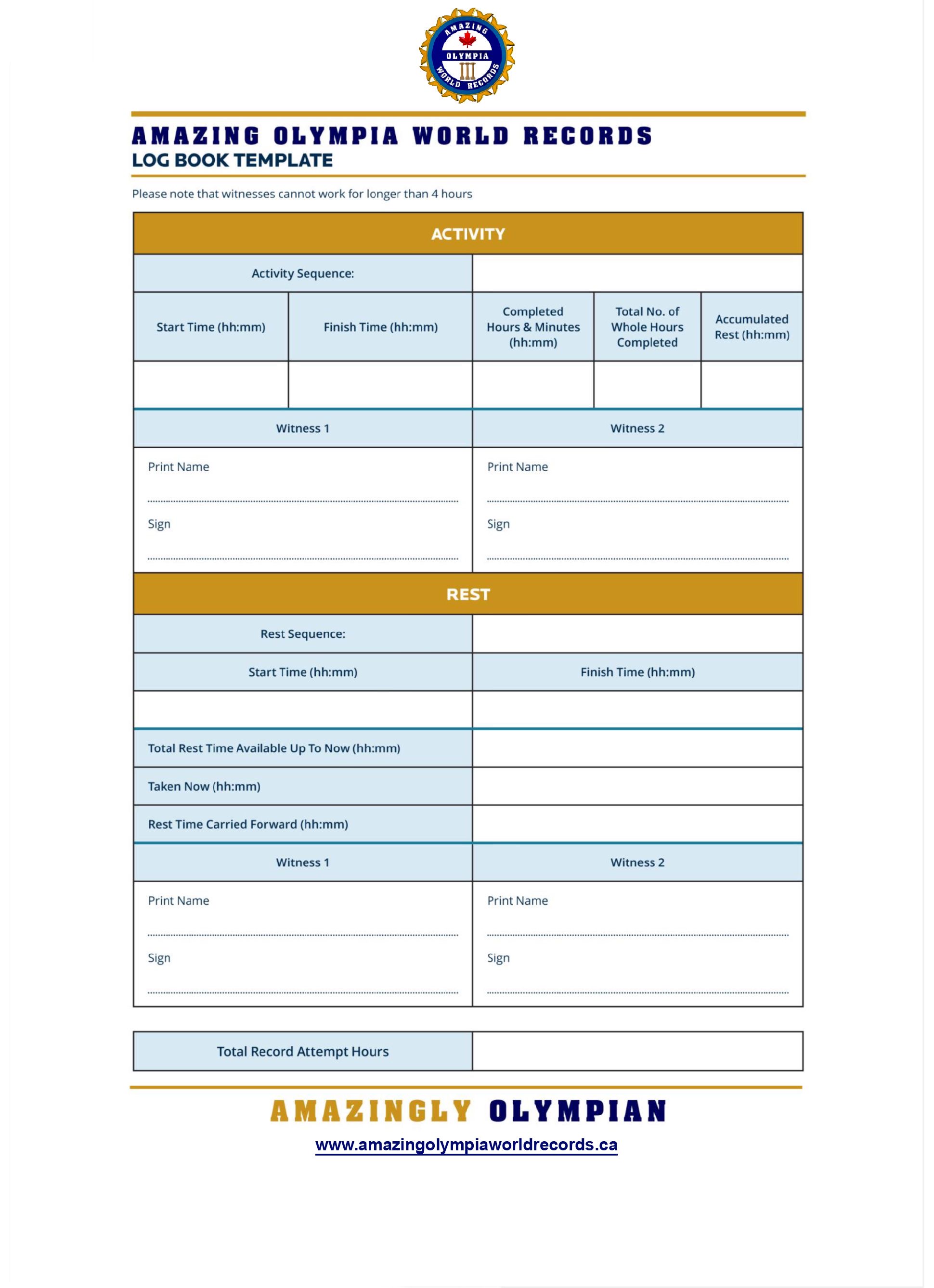 The logbook is an essential part of the evidence for almost all records but record attempts of more than one hour time durations (including journeys and expeditions, and so on). For such record attempts, details of completed activity, rest breaks and what is achieved at what point are required to be accurately entered in the book.