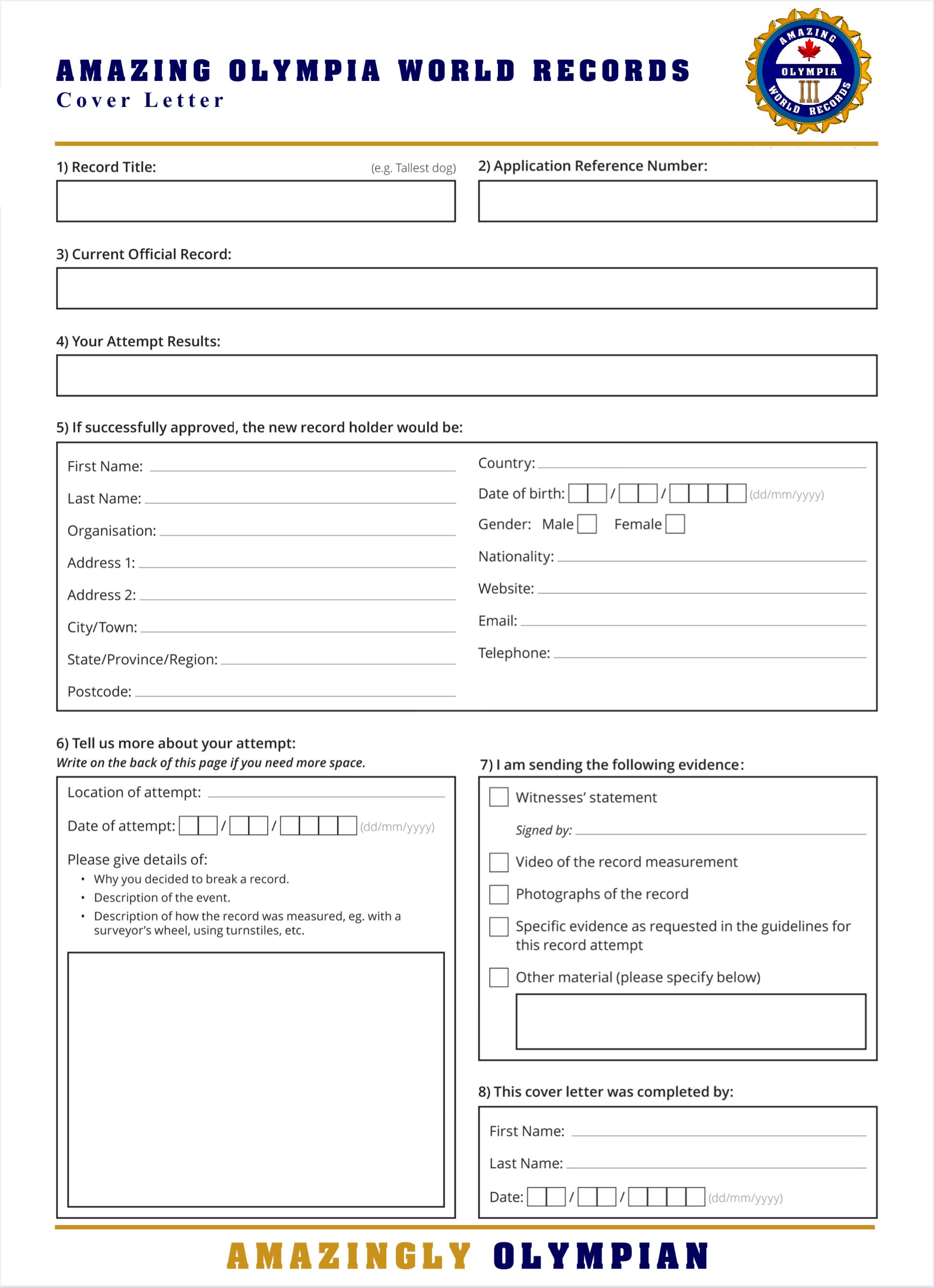 Amazing Olympia World Records provides you with a checklist of items to help you ensure all items are enclosed before you submit your evidence for review. Please note that you have submitted ALL items provided on your evidence checklist to avoid the risk of delay or rejection of your claim.