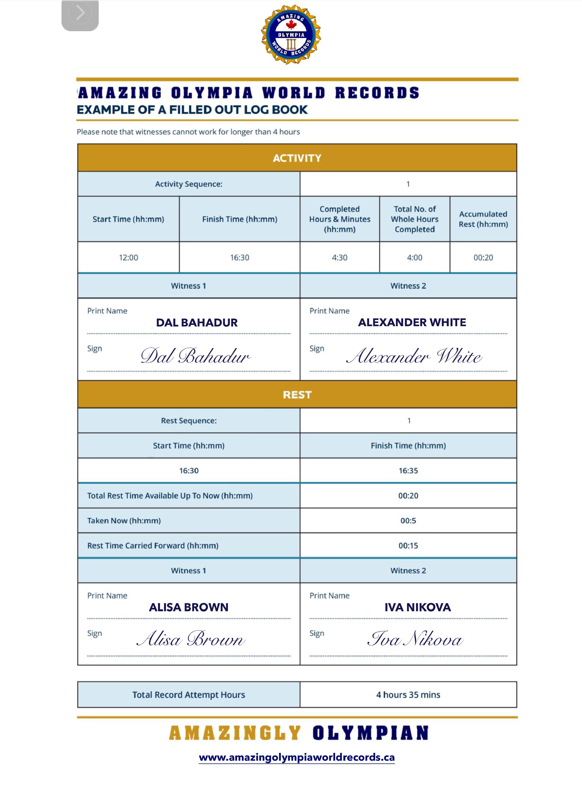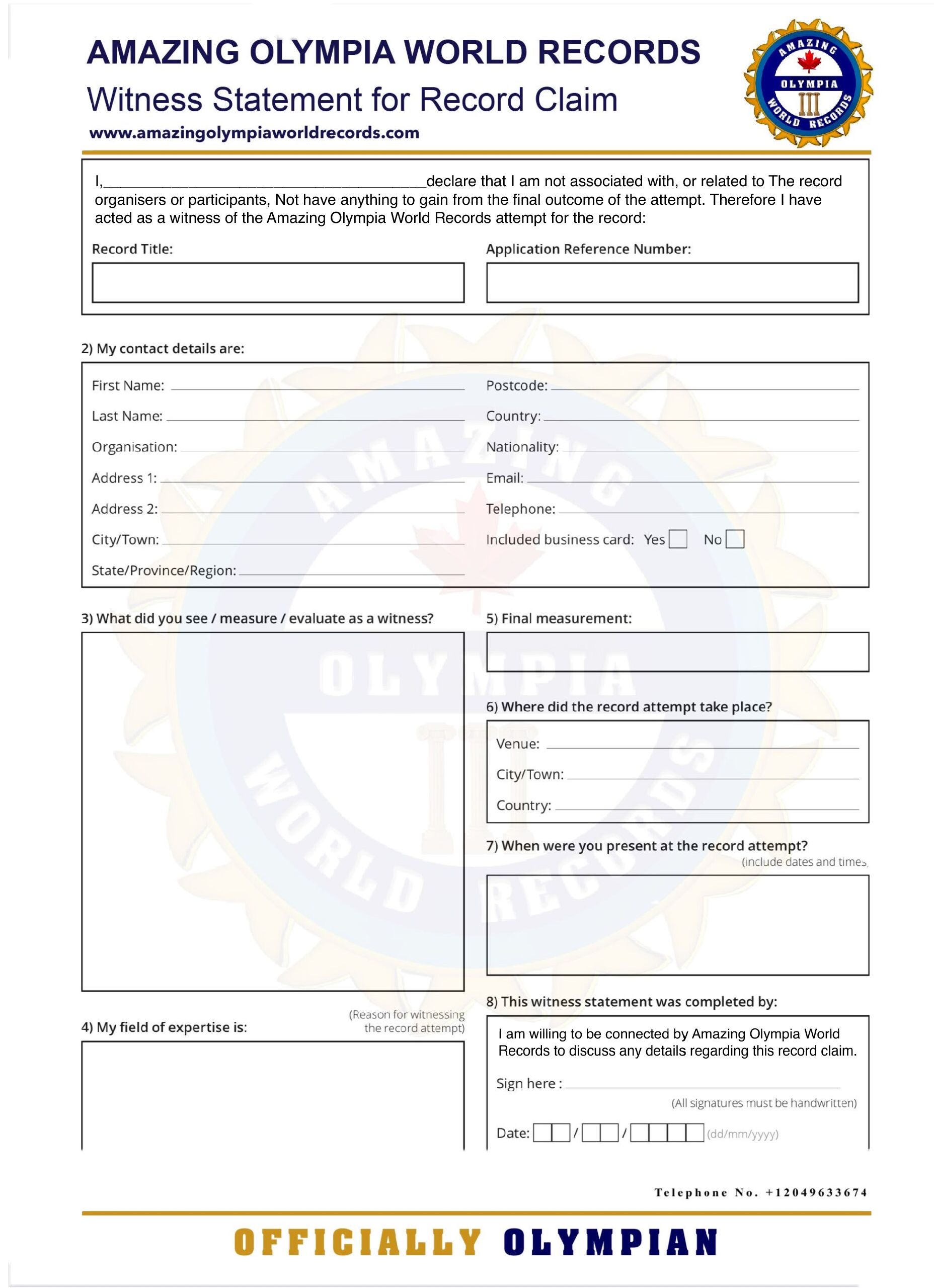 2 Witness statements from independent individuals must be submitted who will verify relevant details of a record attempt where Amazing Olympia World Records Team is not present, they are tasked to confirming whether all Amazing Olympia World Records guidelines have been adhered to, and providing a detailed account of exactly what took place.